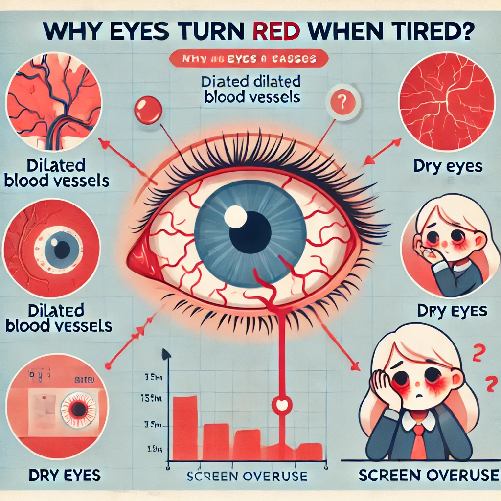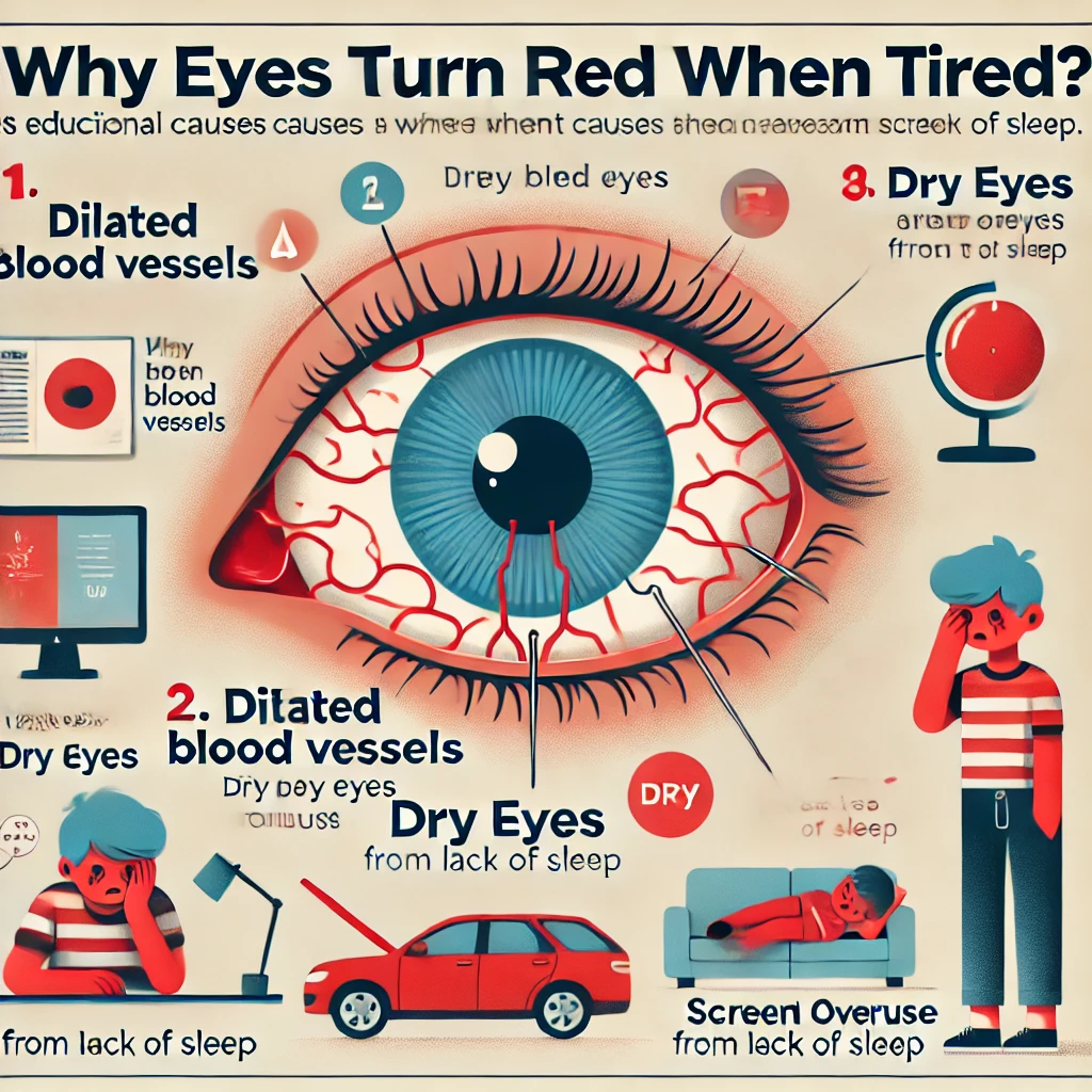 피곤할 때 눈이 빨개지는 이유는 눈의 혈관 확장, 눈물 분비 감소, 산소 공급 부족, 안구 피로, 수면 부족 등이 원인입니다.